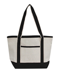 12 oz cotton canvas; Interior zippered pocket 5.5" W x 6.25" H; Exterior front pocket 7.5" W x 6" H; 31" handles with 12" drop; 18.5" x 12" x 5.5";