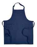 6.9 oz., 100% cotton twill; chino style stitched pockets with rivets; gun metal eyelets secure 35" self fabric ties; top centre pocket; neckband with buckle and adjustable snap button fastening; 34"L x 28"W; Oeko-Tex® Standard 100 certified; WRAP certified;