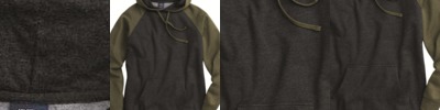 - Raw-edge seams around hood opening, shoulders, pocket seams, cuffs, waistband and side seams