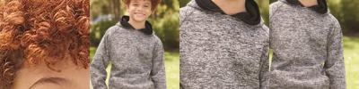 - Charcoal fleck body with contrast-color solid hood, drawcord and sleeves