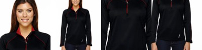 100% polyester wicking knit with true hue technology; True hue technology prevents dye migration; Wicks moisture; Ladies' fit; Tagless label; Quarter-zip pullover style;