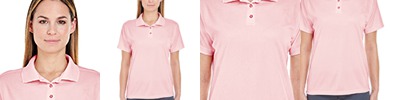 4.1 oz/yd² / 139 gsm, 100% polyester piqué with moisure-wicking, anti-microbial and UV protection performance; Matching flat-knit collar; Four-button narrow placket for feminine look; Side slits;
