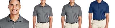 5 oz./yd2 / 172 gsm, 100% polyester face plaited to 60% polyester, 40% cotton back (total overall garment 61% polyester, 39% cotton); Proprietary dual-sided mesh pique knit constructed of fine denier wicking polyester on the outside and soft-as-cotton wicking blend on the inside; Moisture-wicking performance with UV 15-39 protection; Three-button placket; Dyed-to-match buttons; Matching flat-knit collar with contrast double tipping; Hi-low hemline; Side vents; Active fit; Easy care;