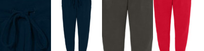 6 oz. 100% polyester; Elastic waistband with black drawcord; Faux fly; Knee piping; Back pocket; Side zipper pockets; Hem cuffs;