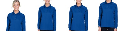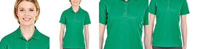 4.4 oz., 100% polyester mesh piqué; Moisture-wicking; UV protection; Feminine fit; Fully taped flat rib-knit collar; Half-moon patch; 3-button placket with dyed-to-match buttons;