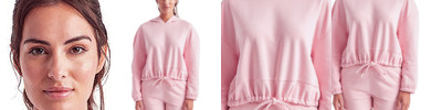 9.25 oz., 55% cotton 45% polyester heathered fleece; 1x1 yarndyed cuffs and waist; Lapover neckline with contrast lined hood; Set-on pouch pocket;