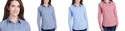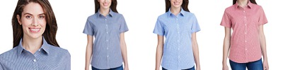 3.4 oz., 100% cotton yarn dyed poplin; semi-fitted styling; gingham microcheck pattern; soft-collar styling; curved hemline; bust and back darts for feminine fit; Oeko-Tex® Standard 100 certified; WRAP certified;
