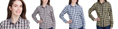 3.4 oz., 100% cotton yarn-dyed poplin; semi-fitted styling; contrast checked pattern; narrow soft-collar; roll sleeve option with button and tab fastening on upper arm; single button cuff and sleeve guard for long-sleeve styling; curved hemline; bust and back dart for feminine fit; Oeko-Tex® Standard 100 certified; WRAP certified;